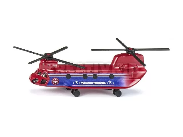 Szállíts árut a helikopterrel. A SIKU szállító helikopter egy piros színű, két nagy rotorral felszerelt kék matricával ellátott szállító helikopter, ami kimondottan áruszállításra használható. A SIKU szállító helikopter modell két nagy rotorja forgatható, a raktér ajtaja lenyitható, így könnyen be tudod rakni az árut a helikopter rakterébe. A SIKU szállító helipkter modell használható más 1:87 méterarányú SIKU járművekkel, készletekkel.