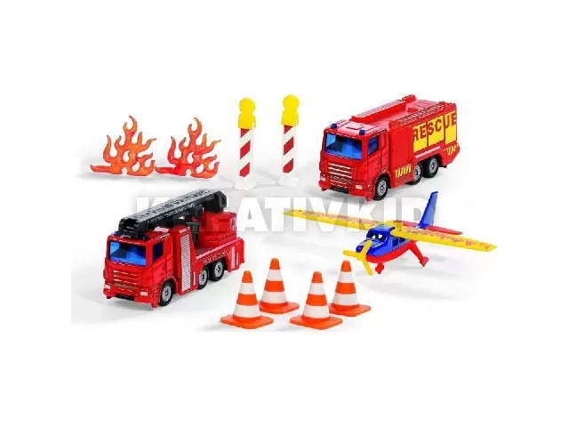 Ez a Siku tűzoltó készlet három egyedi mentőjárművet tartalmaz. A fém vezetőfülkével ellátott háromtengelyes teherautó 360 fokban elforgatható légi mentőplatformmal, három csuklóval rendelkezik. Ez lehetővé teszi, hogy a létrát a hozzátartozó kosárral magasra emeljük, és megfelelően állítsuk be. Ez könnyebbé teszi a nagy magasságból való mentést. Támogatja a tűzoltóautó, amely a helyszínen veszi át a tűz elleni küzdelmet. Mindkét jármű nagy sebességű kerekekkel rendelkezik, amelyek lehetővé teszik, hogy villámgyorsan a vészhelyzet helyszínére hajtsanak.