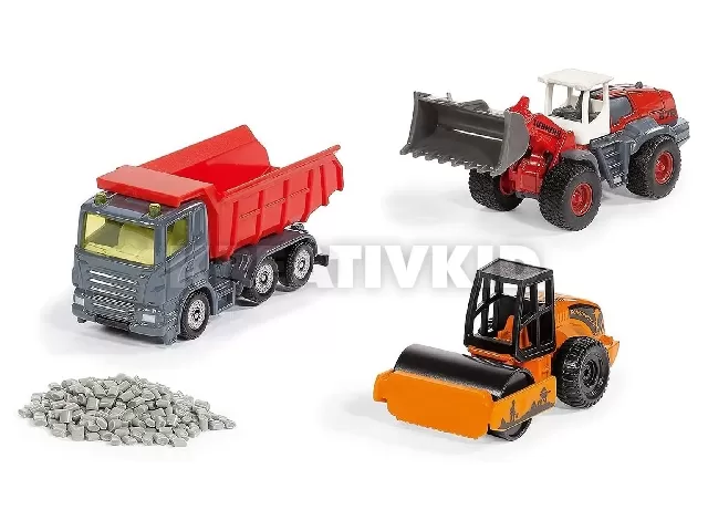 A szürke, billenős teherautó könnyen szállítja oda és onnan az építőanyagokat, billenővályúval rendelkezik. A mozgatható rakodókarral és lapáttal ellátott Liebherr kerekes rakodó könnyedén berakja a törmeléket vagy az építőanyagokat, és mindig pontosan oda gurul a gumírozott abroncsokkal, ahol a legnagyobb szükség van rá. Az úthenger biztosítja az összes anyag pontos felhordását, tömörítését. A forgó görgőnek és az erős fémtestnek köszönhetően ez is nagyon gyors. A készlet szürke granulátumokat is tartalmaz, amelyek ideálisak a billenőkocsiba való berakodáshoz a kerekes rakodóval.