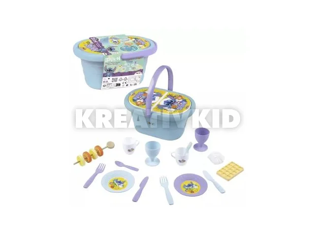Stitch piknikkosár. Könnyű és ergonómikus fogantyúval ellátott, így bárhová magával vihető. A piknikkosár fedele 2 részből áll. 19 kiegészítő tartozik hozzá.