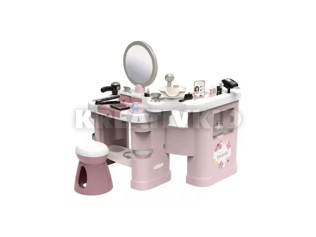 3 az 1-ben szépségszalon: haj, köröm, smink. A termék összecsukható, így kiváló helytakarékos megoldás.3 különálló részből áll: Fodrászati rész: állítható tükör, szék, praktikus tárolórekeszek, és polcok az összes kiegészítő tárolásához.Samponozási rész: samponozási mosdó zuhanyfejjel és valósághű „kattogó” gombokkal.Pénztár: Valódi pult fizetési terminállal, zárható pénztárgéppel és a szolgáltatásokat és árakat részletesen bemutató füzettel.