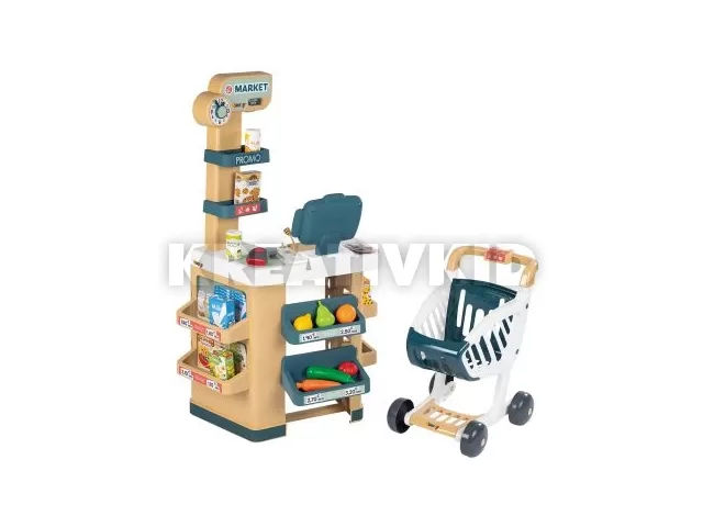 Piac 34 tartozékkal: zöldségek, gyümölcsök, csomagok, konténerek, szkenner hanggal és fénnyel.