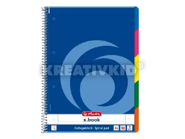 A4-es méretű 100 lapos vonalas spirálfüzet, 70g/m2-es fehér belívvel, margóval, lyukaszott, perforált lapokkal, színregiszterrel (20 laponként egy elválasztó szín), lekerekített sarkokkal.