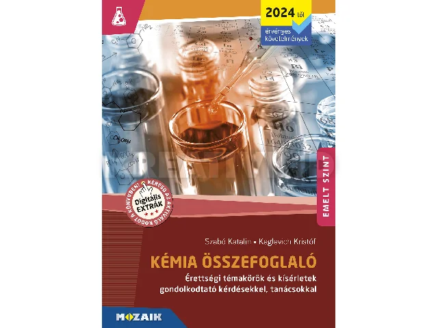 A kiadvány az emelt szintű kémiaérettségire történő felkészüléshez nyújt segítséget. 35 fejezetben részletesen feldolgozza az érettségi teljes tananyagát, magyarázatokkal, összefüggések láttatásával, az adott témához kapcsolódó kitekintésekkel, gyakorlati tanácsokkal kiegészítve. A megértést segítik a kiadványban található informatív ábrák, valamint a könyv digitális változatában elérhető interaktív tartalmak.Minden fejezethez kérdések kapcsolódnak, amelyek a tudás elmélyítését szolgálják. A feladatok megoldásait a könyv digitális változata tartalmazza. Ez a kiadvány hátsó borítójának belső oldalán található kód segítségével érhető el a mozaWeben. A könyv szempontokat ad a kémiai számítások sikeres elvégzéséhez, valamint minden, az érettségin előforduló, elvégzendő és el nem végzendő kísérlet fotóval illusztrált leírása és magyarázata is megtalálható benne.