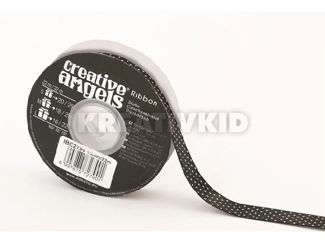 Szatén szalag, 15 mm x 22 m, fekete fehér pöttyökkel