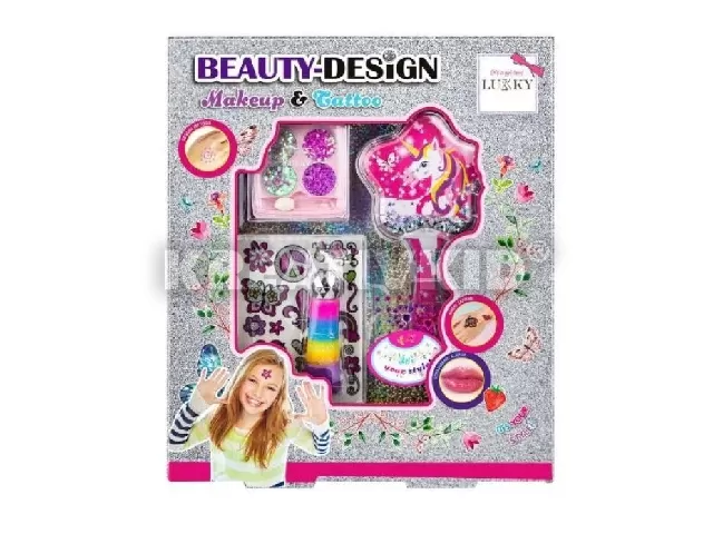 A Lukky smink és tetováló szett mindent tartalmaz, ami szükséges a csillogó és egyedi megjelenéshez. A készlet négyféle színű csillámos szemhéjzselét, mini applikátort, eper illatú szájfényt, csillámos unikornis hajkefét, valamint csillogó és kristályokkal díszített tetováló matricákat is tartalmaz.