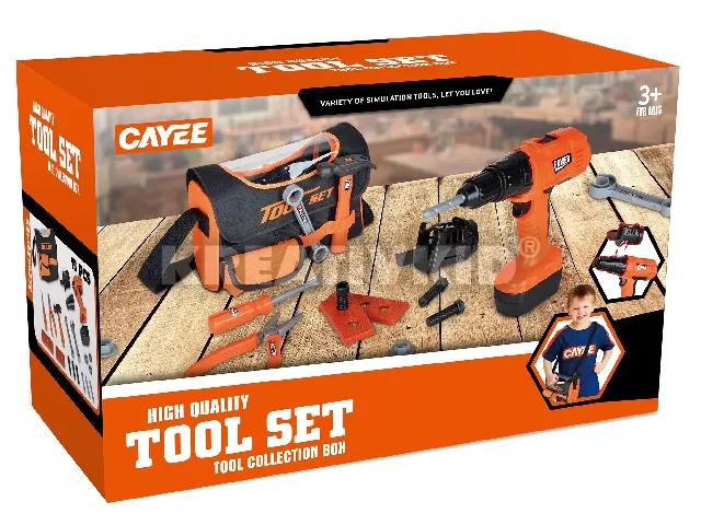 Ebben a barkácskészletben ott van minden, amire csak szükség lehet, ha valamit meg kell javítani vagy össze kell szerelni: 1 csavarhúzó, 1 kalapács, 2 csavarkulcs, 1 fogó, és a legfontosabb, 1 elemes játék fúrógép. Ehhez jönnek még kiegészítők, különböző fúróhegyek, csavarok, stb és hogy a rendszerezéssel és a szállítással se legyen gond, egy vagány táska, amibe minden elfér. Minden olyan, mint az apáé vagy a szerelő bácsié, csak épp biztonságos és csak a gyerekeké.