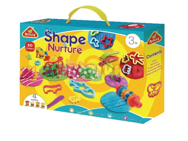 A tégelyben tárolva a gyurmák nem száradnak ki. A csomag 4 színt tartalmaz és 20 formázó eszközt.