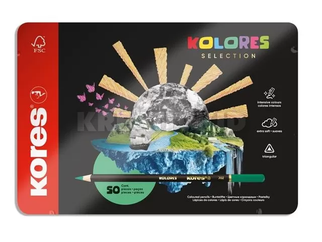 Színes ceruza készlet, háromszögletű, fém doboz, KORES "Kolores Selection", 50 különböző szín