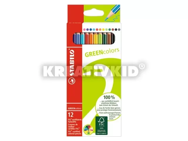 Színes ceruza készlet, hatszögletű, STABILO "GreenColors", 12 különböző szín