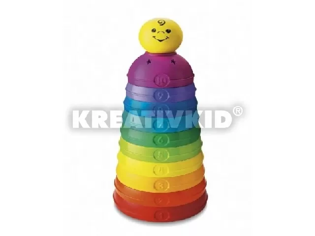 10 színes pohárforma, amiket egymásba, vagy egymásra is lehet tenni, sőt szembe fordítva guruló gömbökké alakulnak át. A csörgő golyó csak fokozza a kíváncsiságot a piramis tetején, és ha a gömbök belsejébe kerül, akkor gurulás közben, nem csak színekkel, hanem hangokkal is helyváltoztatásra ösztönzi a kicsiket. Jó kis pakolgatós játék. 6 hónapos kortól jó hatással van a mozgásfejlődésre, majd a számok megismeréséhez is hasznos társ lehet.