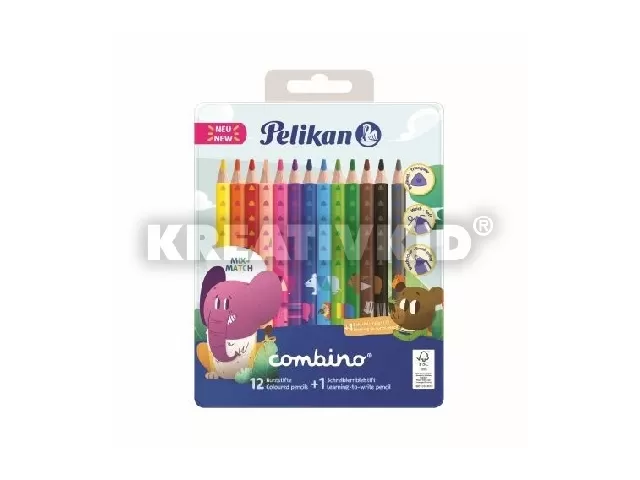 Színesceruza/12 szín + 1 grafitceruza Combino, ragyogó és intenzív színek (bőrszín is), puha, minőségi ceruzabél, vastag, háromszögletű, feliratozható ceruzatest, állatmotívumokkal, melyek egymáshoz illesztve fantáiza állatok kialakítását teszi lehetővé, 4 mm-es bélvastagsággal, törésbiztos béllel, 100%-ban FSC fából. A grafitceruza B-s keménységű.