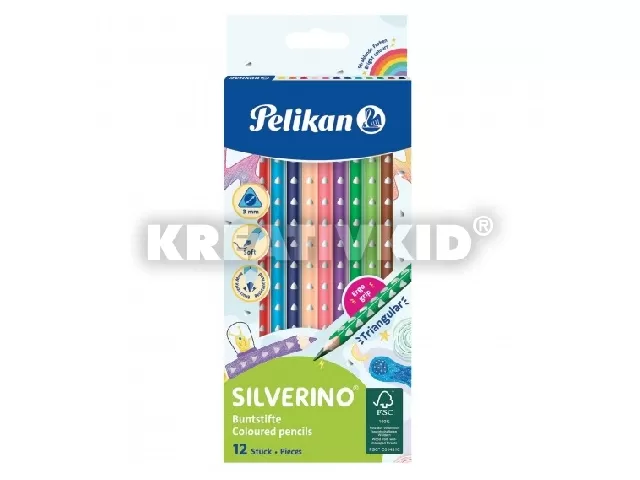 Színesceruza/12 szín Silverino, ragyogó és intenzív színek, ergonomikus háromszög ceruzatesttel, ezüst háromszög dombormintával a könnyed ceruzafogásért, puha, minőségi 3 mm-es bélvastagsággal, törésbiztos béllel, 100%-ban FSC fából, feliratozható.
