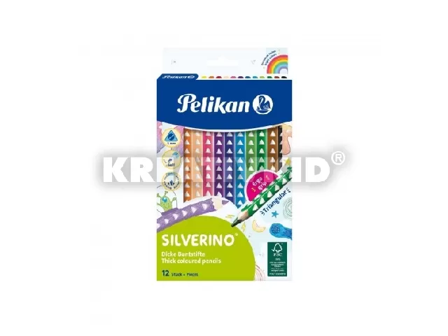 Színesceruza/12 szín Silverino, ragyogó és intenzív színek, vastag, ergonomikus háromszög ceruzatesttel, ezüst háromszög dombormintával a könnyed ceruzafogásért, puha, minőségi 5 mm-es bélvastagsággal, törésbiztos béllel, 100%-ban FSC fából, feliratozható.