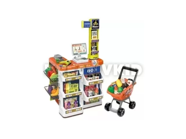 - Teljes szupermarket állvány pénztárgéppel, vonalkódleolvasóval és polcokkal