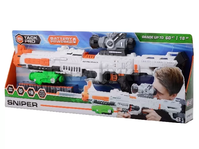 Célozz és lőjj a nagy Serve and Protect puskával! A Serve and Protect szivacslövő fegyver egy műanyag puska, ami ártalmatlan szivacsos lőszereket lő ki magából. A fegyver minden extrával, optikai irányzékkal, forgótárral és válltámasszal is fel van szerelve, a puskával pillanatok alatt profi kommandóssá válhatsz! A fegyver egyesével lövi ki a szivacs lőszereket, az irányzékkal nagyon pontosan lehet célozni akár 8 méteres távolságba is. A Serve and Protect szivacslövő fegyver készlet 22 darab szivacsos lövedéket is tartalmaz, a fegyvert NERF lőszerekkel is lehet használni. A Serve and Protect puska mérete: 75 cm.