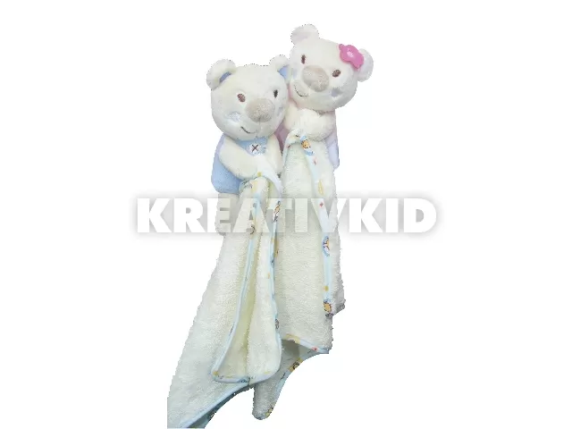 Cukikölykök takarós maci, két színben. Szeretnivaló kismaci pihe-puha takaróval a kezében vajszínű-világoskék, vagy vajszínű-rózsaszín kombinációban kapható. A kismaci 14 cm magas, takarója 26 x 26 cm-es. Puhasága és nedvszívó képessége miatt már az újszülött babáknak is adható, illetve fogzás idején hasznos lehet. A babák szívesen tartják kezükben, morzsolgatják vagy épp szájukba veszik a csücskeit. A játék mosható. Újszülött kortól ajánljuk.