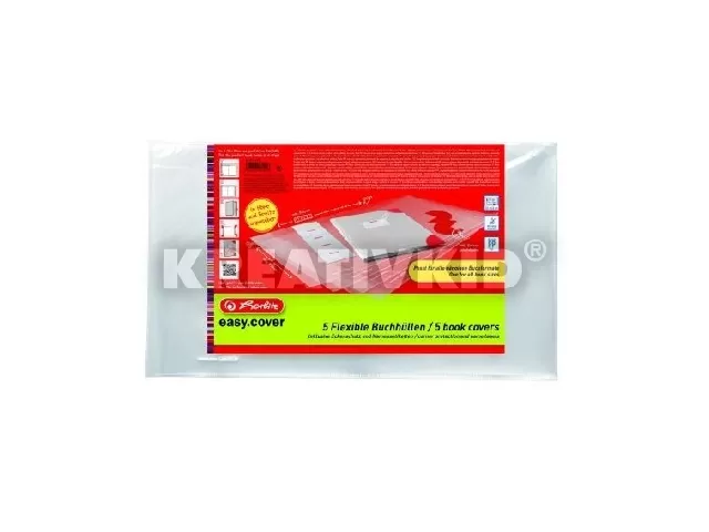 Easy cover ragasztás nélküli tankönyborító, víztiszta, 58,5x34 cm-es méretben mely könnyedén a különféle méretű tankönyvekre igazítható, piros sarokvédővel, névcímkével, 5 db/csomag.