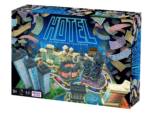 A Hotel társasjáték - kék minden idők egyik legnépszerűbb hotelépítő, kereskedős társasjátéka, és most vadonatúj csomagolásban jelent meg. A játékosok a világ leggazdagabb befektetőiként telkeket vásárolnak, szállodákat és szabadidőparkokat építenek - és persze igyekeznek csődbe vinni a konkurenciát. A szabályok egyszerűek, a bérleti díjak magasak, a harc az ingatlanpiacon kegyetlenebb, mint bárki is gondolná! A Hotel könnyed, dobókockás társasjáték, amely megtanítja a gyerekeket a pénzzel bánni. A 3D-s épületelemek rendkívül látványossá teszik a játékot!
