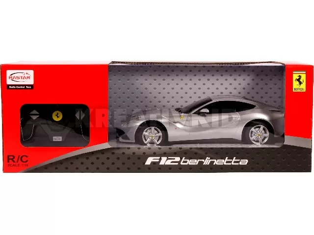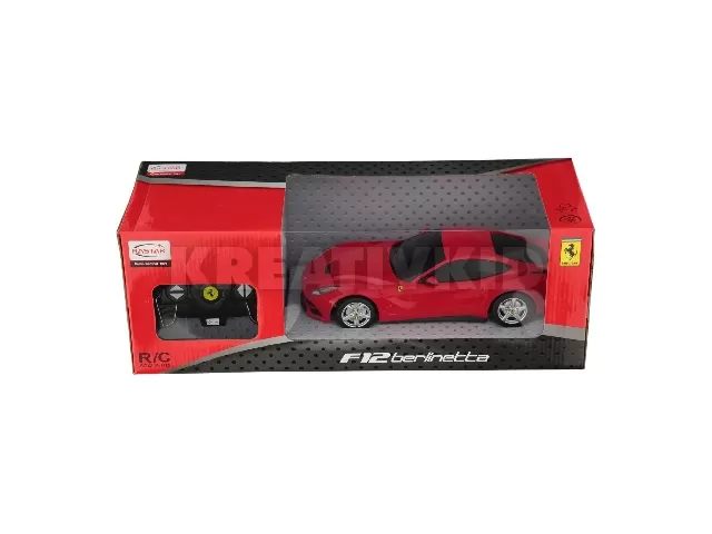 Távirányítós Ferrari F12 autómodell, 1:18 méretaránnyal, többféle színben. A Ferrari F12 sportautó műanyag karosszériás, nagyon szép kidolgozású, szinte megszólalásig hasonlít az eredeti Ferrari F12 autóra, menet közben az autó fényszórói és féklámpái világítanak. A távirányítós autó 13-16 km/h maximális sebességre képes, a távirányító hatósugara 10 m. A távirányító 2 db AA ceruzaelemmel, a Ferrari F12 autó 4 db AA ceruzaelemmel működik, a csomagolás az elemeket nem tartalmazza. Autó mérete: kb. 35 cm.