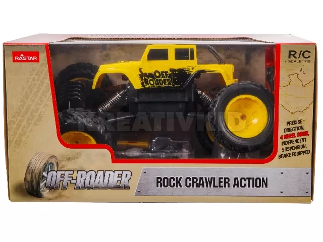 Nagy méretű terepjáró, hatalmas kerekekkel és távirányítóval! Az 1:18 méretarányú Rastar Távirányítós Rock Crawler Action egy műanyag karosszériával készült terepjáró autó, rugós felfüggesztéssel. A terepjáró minden irányba tud haladni, a villanymotor minden kereket meghajt, az autó a legnehezebb terepviszonyokat is könnyen veszi! A Távirányítós Rock Crawler Action távirányítója kormány alakú, a távirányító 1 db 9V-os elemmel, az autó 6 db AA ceruzaelemmel működik, a csomagolás csak a ceruzaelemeket tartalmazza. Méretek: 32 x 21 x 15 cm.