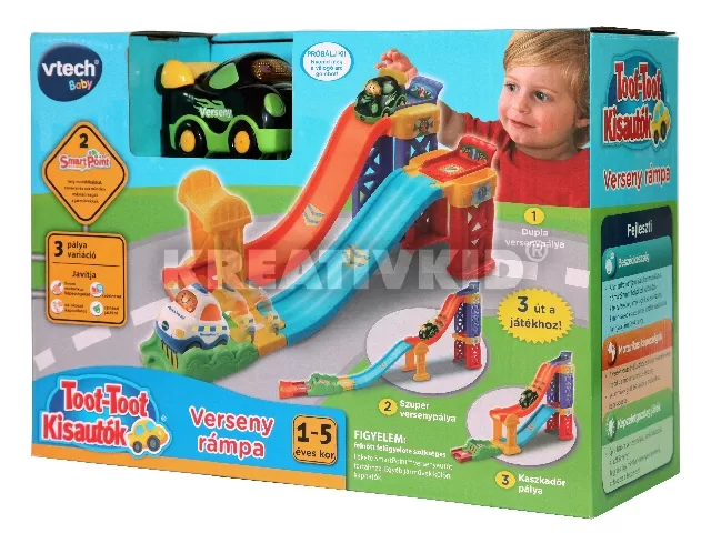 A VTech Toot-toot kaszkadőr pálya 3 módon is összeállítható: dupla verseny pályának, kaszkadőr pályának és szuper versenypályának is építheted. A szett tartalmaz 1 db Toot-toot kisautót is. A pálya elemei kommunikálnak a Toot-toot kisautók mindegyikével a Smart-point-okon keresztül. Csomagolási méretek: 30 x 12 x 22 cm.