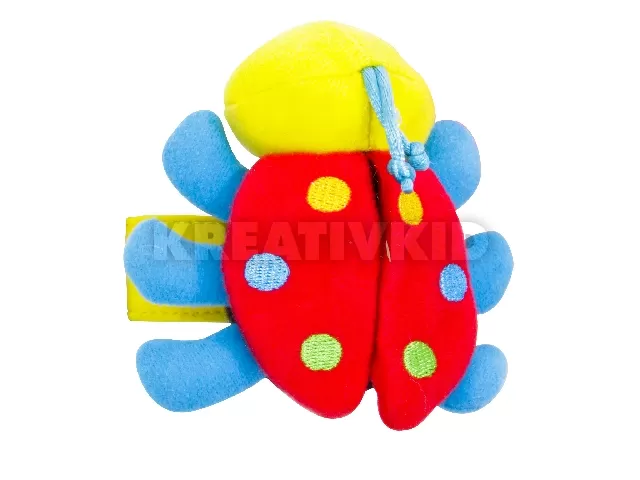 Puha textil bébijáték, mely a baba csuklójára rögzíthető tépőzárral, így mozgásra ösztönzi. A bogárka szárnya csörgő-zörgő anyagból készült.