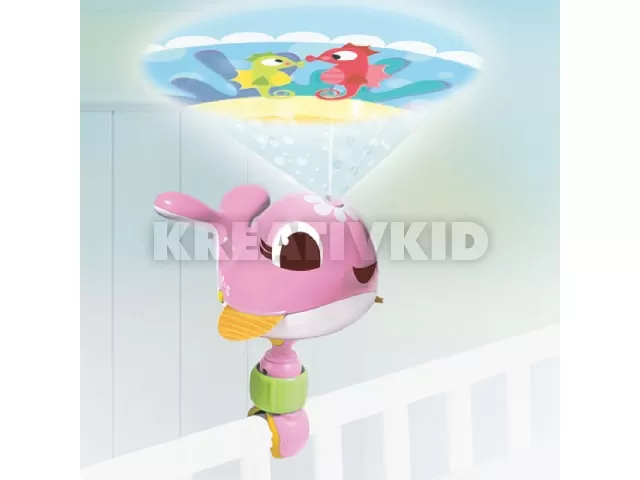 Ez a kedves hordozható bálna formájú kivetítõ univerzális rögzítõvel rendelkezik. Segítségével könnyen hozzá csíptethetjük a kiságyhoz vagy az utazóágyhoz. A klip eltávolításával pedig elhelyezhetjük egyenes felületen is, mint az asztal vagy polc. A vetítõ kedves képeket vetít, amit aláfestõ zene kísér. állatkákról. A 30 percig hallható zene erõssége állítható vagy akár ki is kapcsolható.