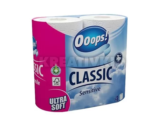 Toalettpapír, 3 rétegű, kistekercses, 4 tekercs, OOOPS "Classic", sensitive
