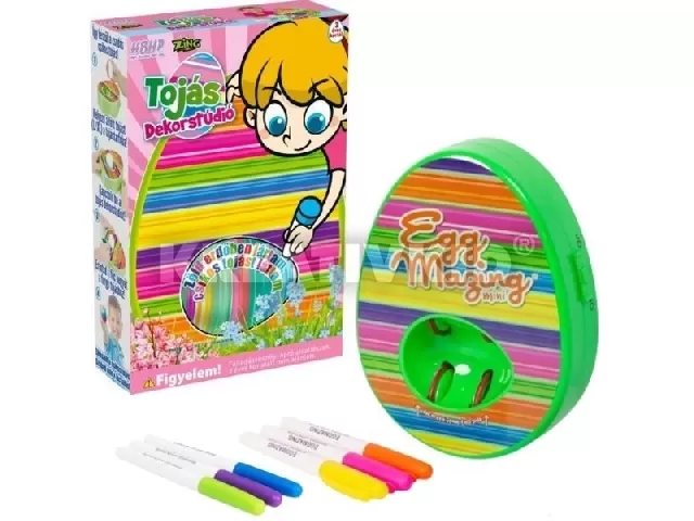 A Tojás dekorstúdióval egyedi, csíkos hímestojások készülnek. A húsvéti kézműveskedéshez ideális stúdióba be kell helyezni a főtt tojást, majd a pörgő tojáshoz hozzá kell érinteni a filc hegyét. A tojásdekorálás a tojás Dekorstúdióval egyszerű, kreatív és maszatmentes. A csomagolás a dekorstúdiót és hat, színes, károsanyagmentes filctollat tartalmaz. A csomag az elemeket nem tartalmazza. 3 éves kortól ajánlott.