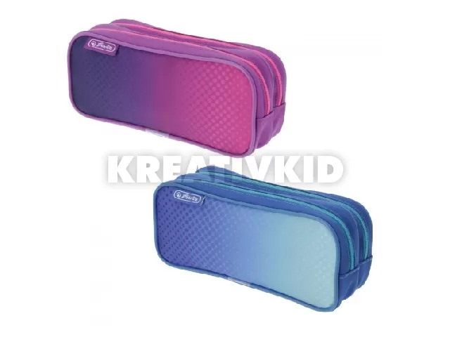 Két rekeszes üres dupla tolltartó 20,5x7x9 cm-es méretben. Anyaga: poliészter, vegyes mintákkal.