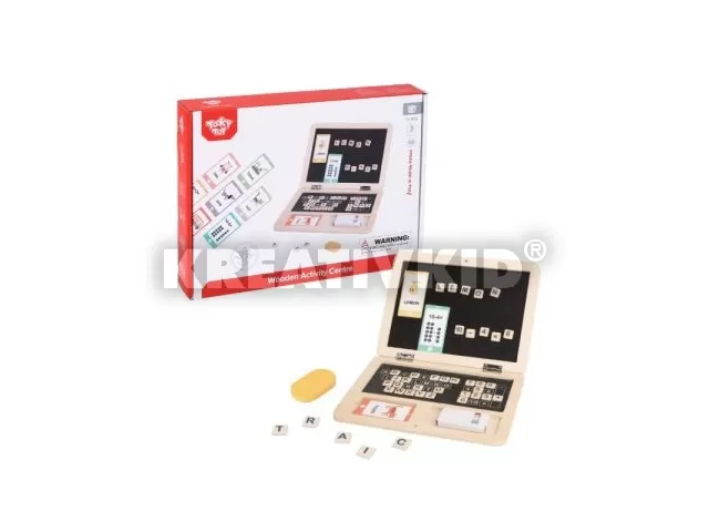 A Tooky Toy betűk és számok rajztáblás foglalkoztató fajáték segítségével a gyerekek játékosan ismerkedhetnek meg a számok és a betűk világával. A kettényitható tábla egyik oldalára az ABC-t és a számokat tudják a helyükre rakni a kis mágneses fa lapkák segítségével. A másik oldalára krétával írhatnak, és az okostelefon formájú kártyákon lévő képeket betűzhetik is, valamint gyakorolhatják az összeadást és a kivonást. A kréta könnyedén lemosható a tábláról a szivacs segítségével.