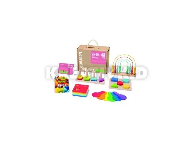 Ez a Montessori jellegű oktató szett több különböző játék gyűjteménye. A dobozban található formakirakó, golyóvezető, színes műanyag "nagyítók", rúdra rakosgatható alakzatok, színkönyv...