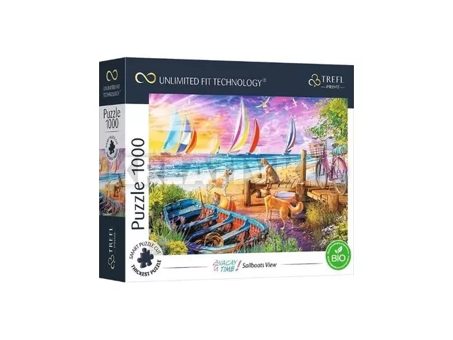 Prémium minőségű, 1000 darabos puzzle, amely vitorlásokat és kutyákat ábrázol a tengerparton. A vastag anyagból, különleges vágási módszerrel készült elemek tökéletesen illeszkednek egymáshoz, ennek köszönhetően könnyedén mozgatható a teljes puzzle egyben.