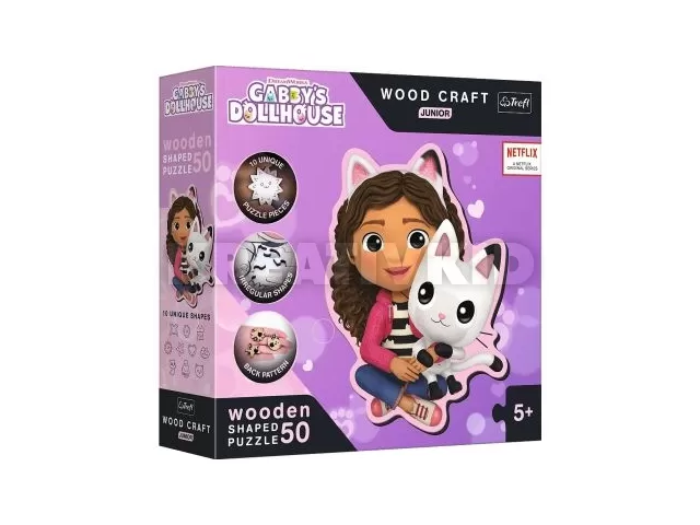 Prémium minőségű, 50 darabos puzzle, amely a Gabby babaházából jól ismert Gabit és Pandi cicát ábrázolja. A különleges és szabálytalan alakú, fából készült elemek tökéletesen illeszkednek egymáshoz.