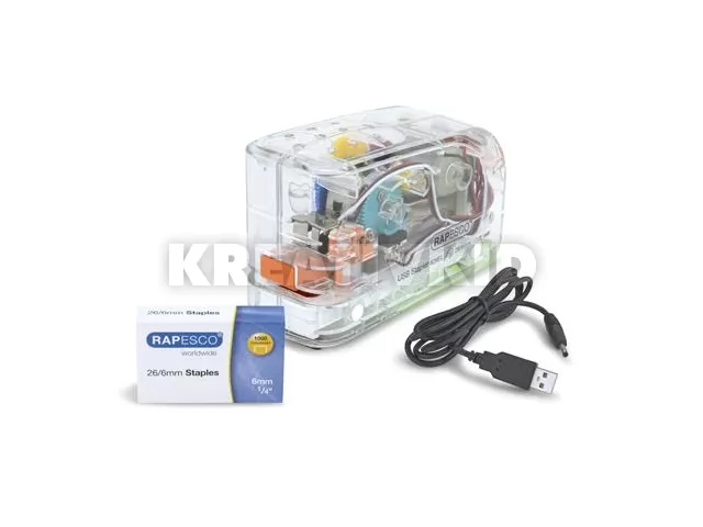 Tűzőgép, 26/6, 15 lap, elemes, USB töltővel, RAPESCO "626EL", átlátszó