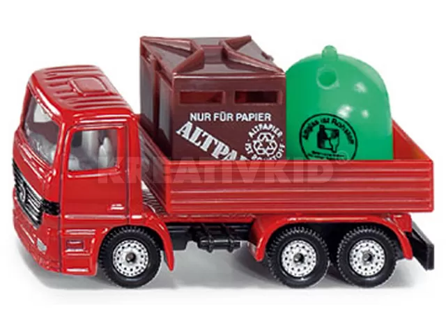1:87 méretarányú Scania szelektív hulladékszállító autó a Sikutól. A járgány fém és műanyag felhasználásával készült, egyes részei mozgathatók.