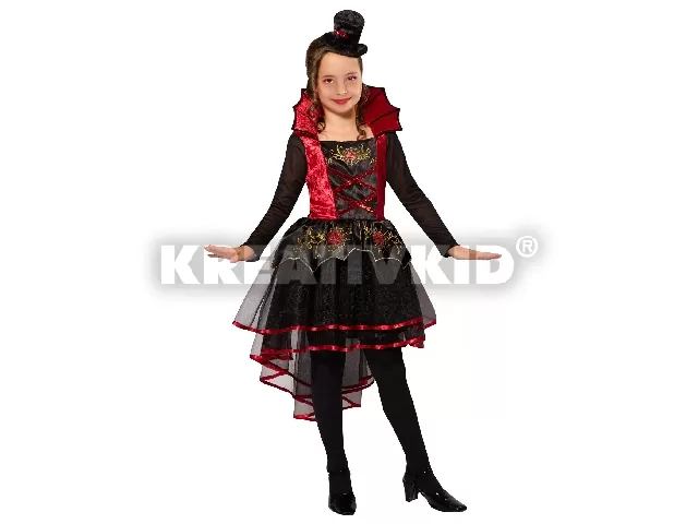 A Widmann márkájú jelmez bájosan ijesztő vámpírlányt varázsol az ember kislányából. Fekete és piros színekkel, gyönyörű rózsás és fűzős részletekkel, valamint a szoknyarésznél fátyollal ellátott kosztüm. A jelmez abszolút alkalmas egy játékos Halloween partira vagy a farsangi szezonra. A vámpírlány jelmez szett tartalmazza a ruhát, illetve kiegészítőként a hozzá tartozó kalapot. Legyen kislánya a legbájosabb vámpírlány a bálon!
