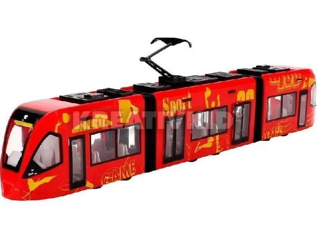Piros, sárga díszítésű városi villamos gyermekjáték.