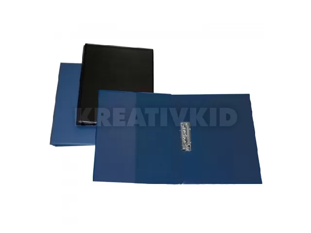 Villámzáras mappa A4-es méretben, fém leszorító szerkezettel, kívül PVC borítással, karton belsővel, kék és fekete színben.