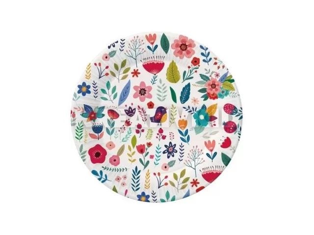 Fehér alapon színes virág és madárka mintával díszített papírtányér szett. A csomag 6 db tányért tartalmaz.