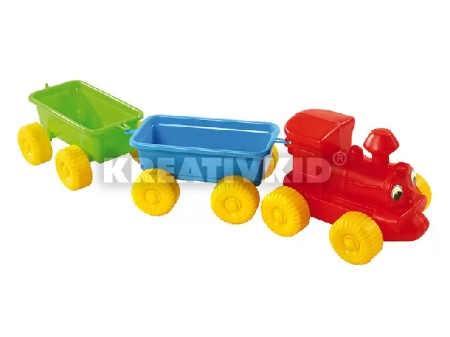 Az élénk színű, műanyag vonat szett nagy kerekekkel ellátott, így beltéren és kültéren egyaránt használható. Az egymással összefűzhető vonatkocsikba pakolni is lehet.