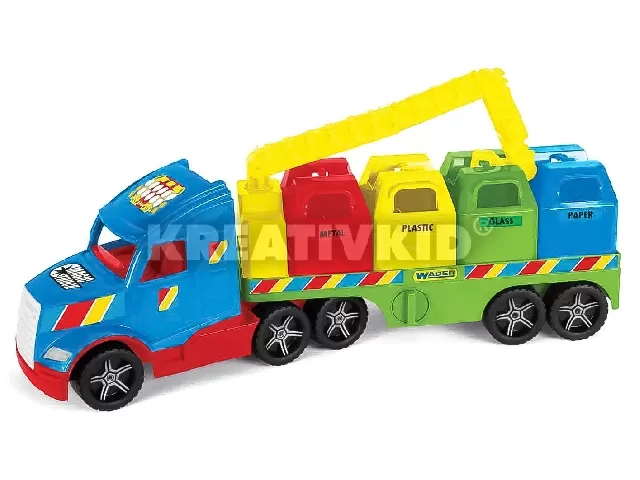 A készlet tartalma: jármű, 4 szemetes konténer az alsó részén és egy mobil félpótkocsiról eltávolítható mobil daru. Az autó eleje fluoreszkáló lámpákkal van felszerelve, amelyek fény hatására sötétben világítanak