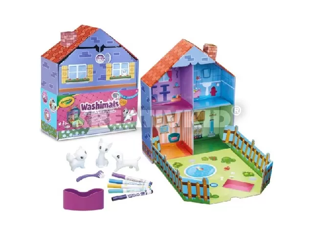 A szett tartalma: 1 összecsukható játékházikó, 1 játékkád, 3 állatka (2 cica és 1 tacskó), 1 súroló kefe, 5 filctoll, 1 használati utasítás.