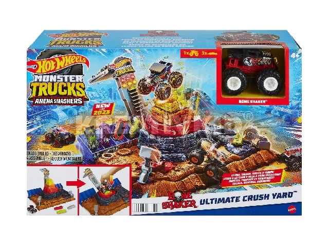 Szörnyetegek az arénában! A Hot Wheels Monster Trucks Live Arena játékkészletekkel ütközésekkel és zúzásokkal teli show-t rendezhetsz. Mindegyik készlet más elemeket és kihívást tartogat. A Live Aréna Döntőben készlet a Monster Trucks Bone Shaker karaktert kelti életre, de úgy, hogy abba még a föld is beleremeg, ha egy Monster Trucks kisautóval ráhajtasz. A készlet 5 akció területtel rendelkezik a végtelen zúzások végrehajtásához. A pályaszett egy Hot Wheels Monster Trucks kisautót és három összezúzható járgányt is tartalmaz. A készletek összekapcsolhatók a többi Aréna pályaszettekkel, hogy egy fantasztikus Monster Trucks stadion építhess.