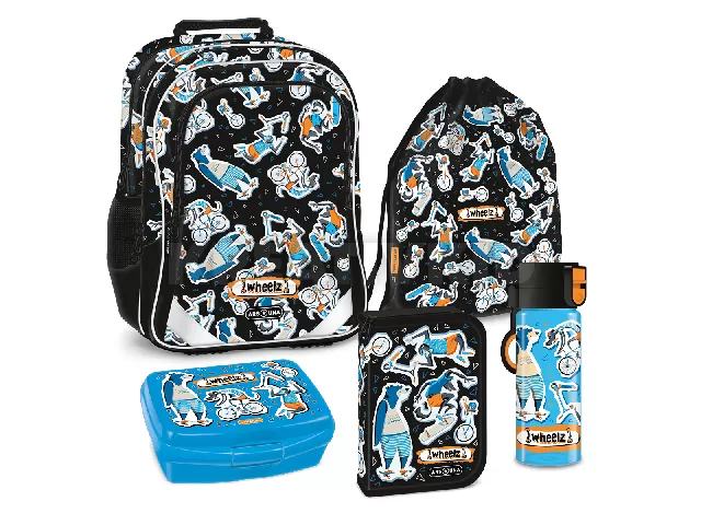 A szett tartalma: ergo fit iskolatáska, töltött tolltartó, sportzsák, uzsonnás doboz, kulacs.
