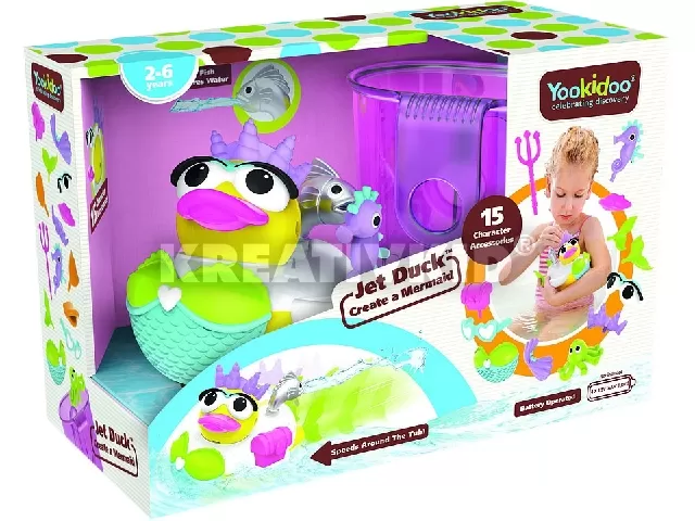 Elemmel működő fürdőjáték  A termék az alábbi részekből áll: • 1 db. kacsát formázó műanyag játék figura ), mely magában foglal egy elemmel működő szivattyút;• 15 db., a kacsára rögzíthető dizájn elem mely segítségével a kacsa a kiválasztott termék típusának megfelelően átalakul • 1 db, a kacsa és a dizájn elemek tárolására szolgáló, tapadókorong segítségével a kádhoz rögzíthető műanyag tároló edény A játék működtetőjéhez 4 db 1,5 voltos AA (RL6) típu típusú ceruzaelem szükséges. A ceruzaelemeket külön kell megvásárolni, azokat a játék a megvásárláskor nem tartalmazza.