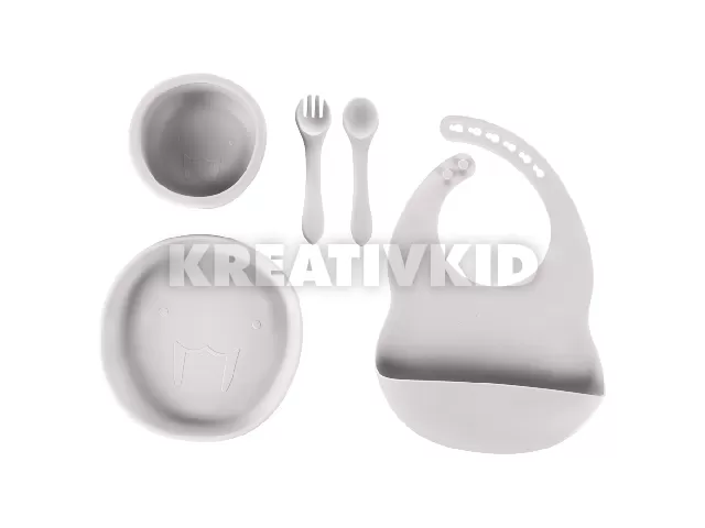 Az élelmiszeripari minõségû szilikon étkészlet tartalmaz egy emelt szélû tálat tapadókoronggal, egy osztott tányért tapadókoronggal, egy állítható elõkét és egy kanalat.